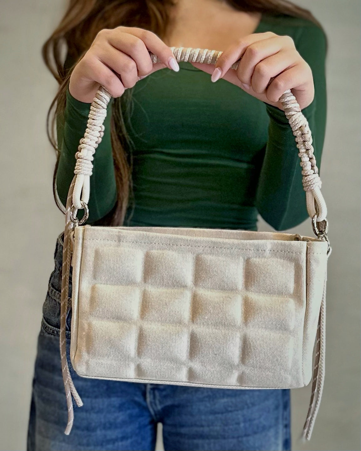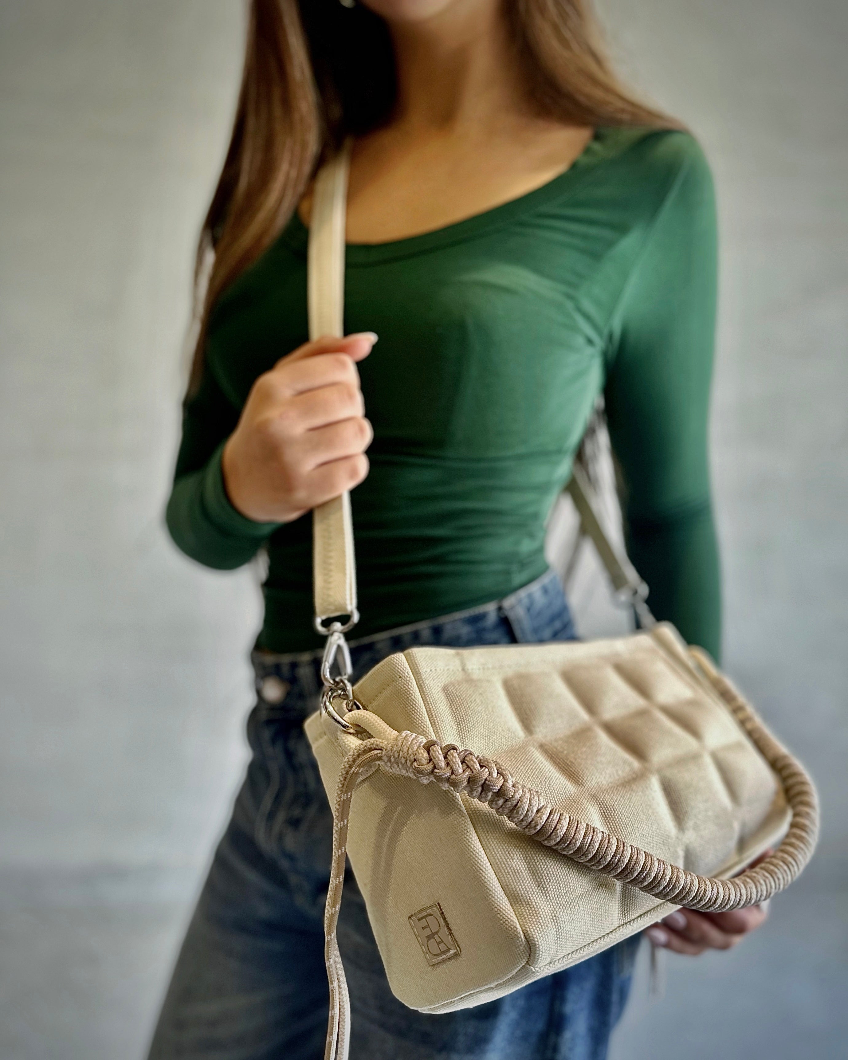 A timeless pattern with a contemporary twist.. Spacious enough to carry your daily essentials while maintaining a sleek, polished silhouette, our QUILTED CARMEL KNOT offers the perfect balance between style and practicality. The rope shoulder strap is carefully hand-crafted with decorative knots, adding an artistic aesthetic to the design. The quilted construction conveys a luxurious feel adding depth and sophistication.